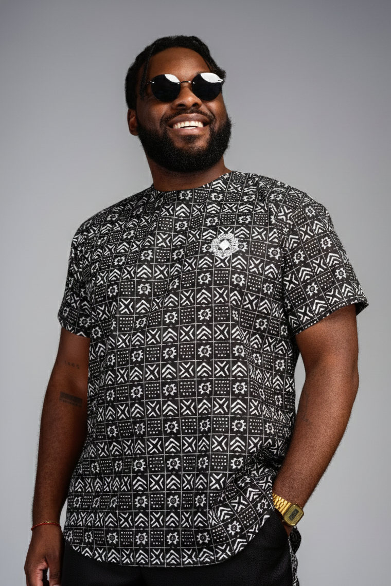 The Bogolan T-Shirt brings a fresh balance of heritage and modern style. Designed in a timeless black-and-white colourway, this premium piece is crafted from sublimated fabric for lasting vibrancy and durability. Its soft stretch ensures breathability and all-day comfort, while thoughtful tailoring—side slits, a back yoke pleat for ease, and a clean zip closure—adds subtle refinement.