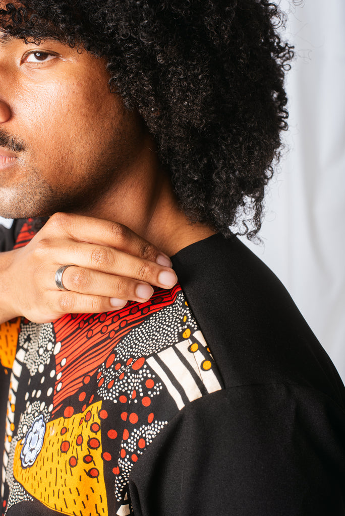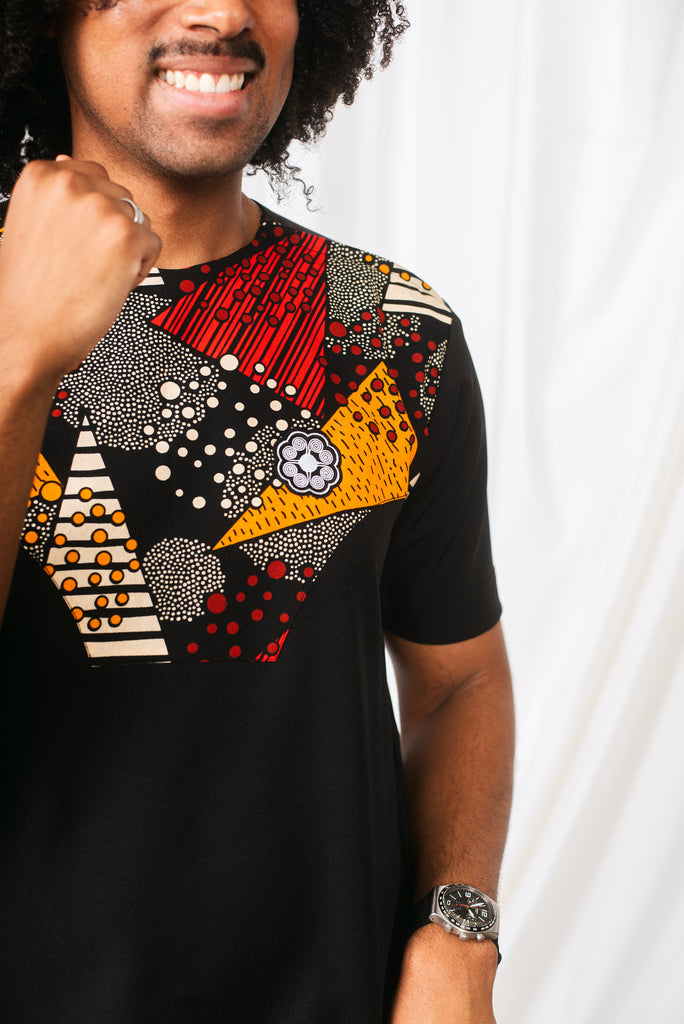 Featuring a clean crew neckline, back yoke with pleat, and a subtle zip detail, this tee combines structure with ease. Crafted in the Mahiri print — meaning vibrant — it stands as a bold expression of energy and connection.