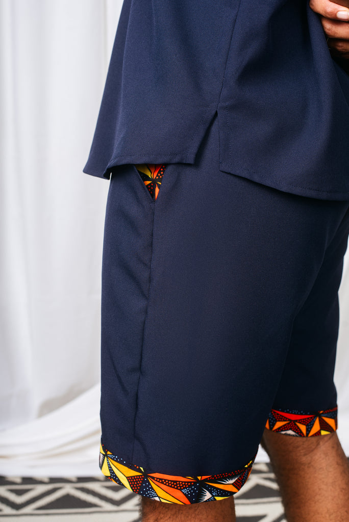 Designed with a Dashiki-inspired Henley neckline, a back yoke with pleat, and a subtle zip detail, this tee strikes the perfect balance between structure and ease. Crafted in deep navy polyblend fabric and elevated with vibrant Ninzi Ankara print accents, it exudes boldness and cultural flair.