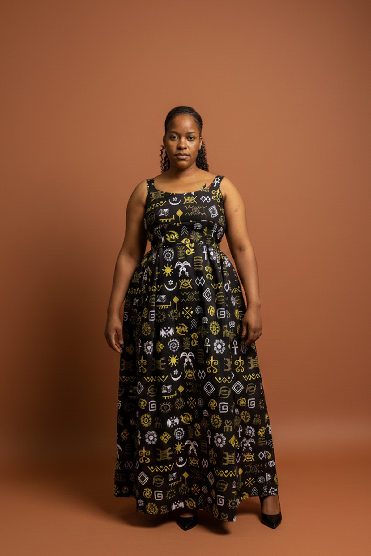 The Maxi Adinkra Print Dress is a bold celebration of culture, movement, and effortless elegance. Crafted in a fit-and-flare silhouette, it gently defines the waist before cascading into a full, flowing skirt that creates beautiful motion with every step.