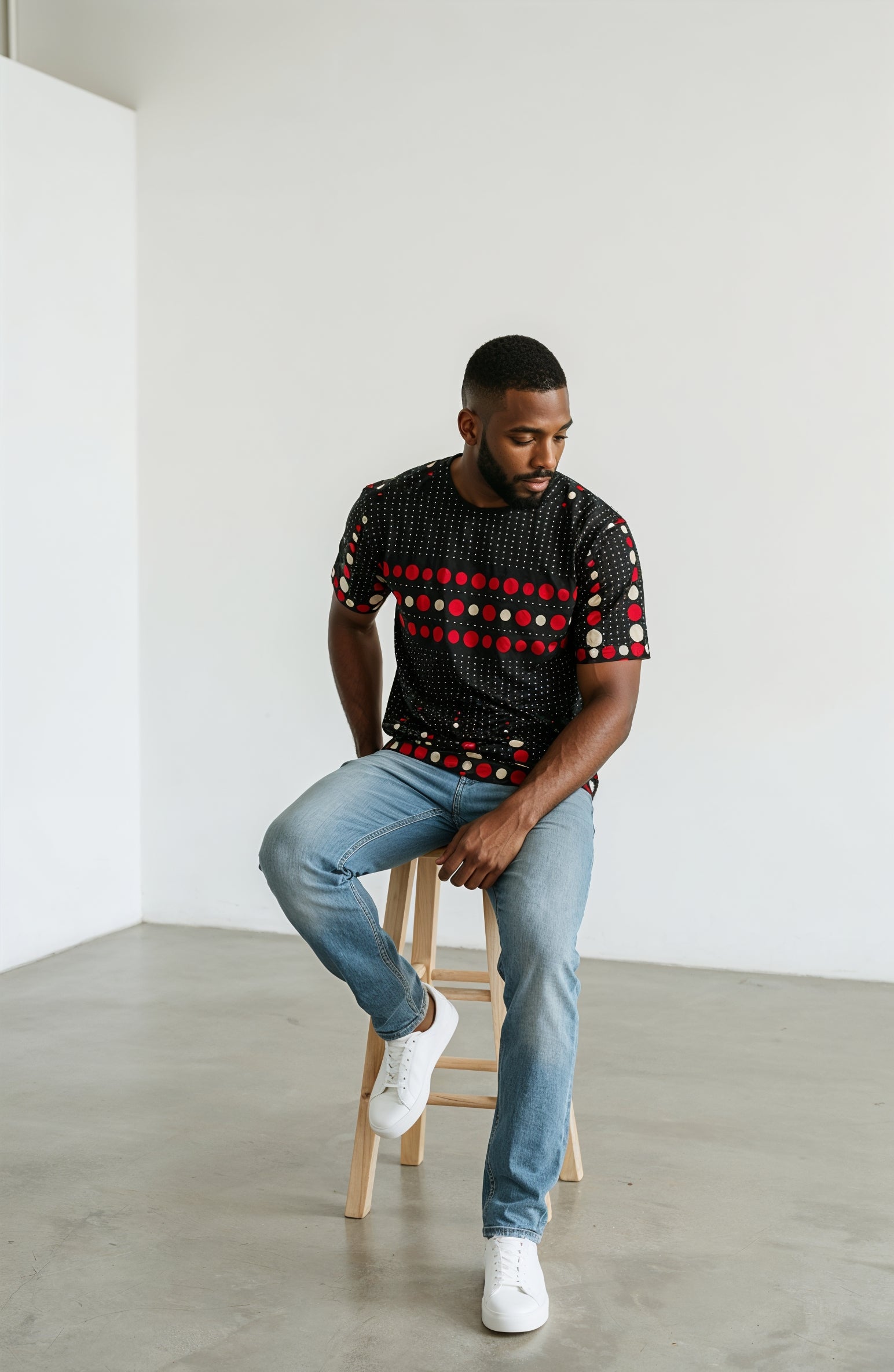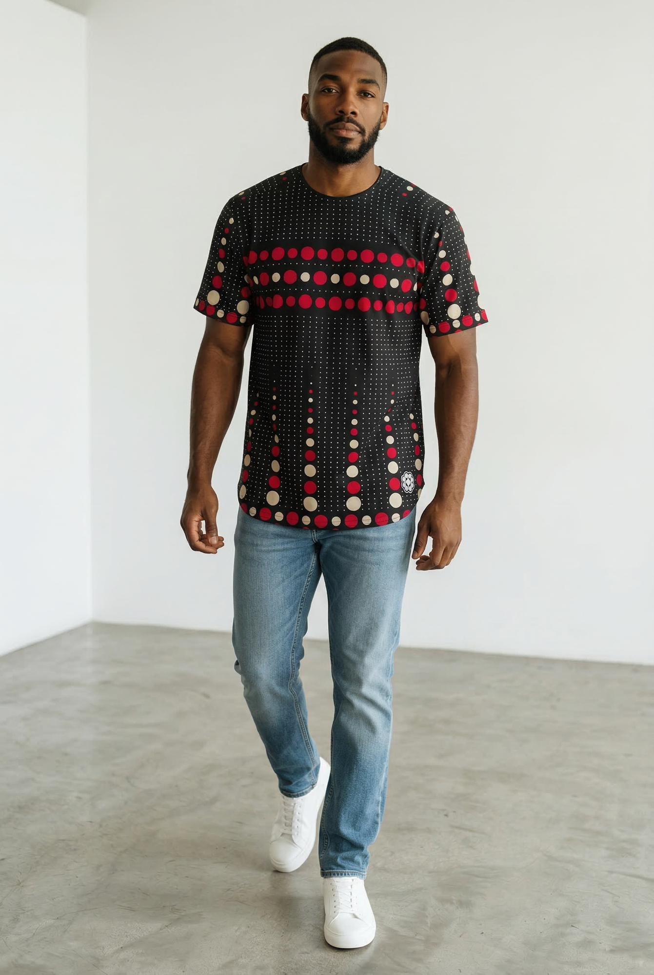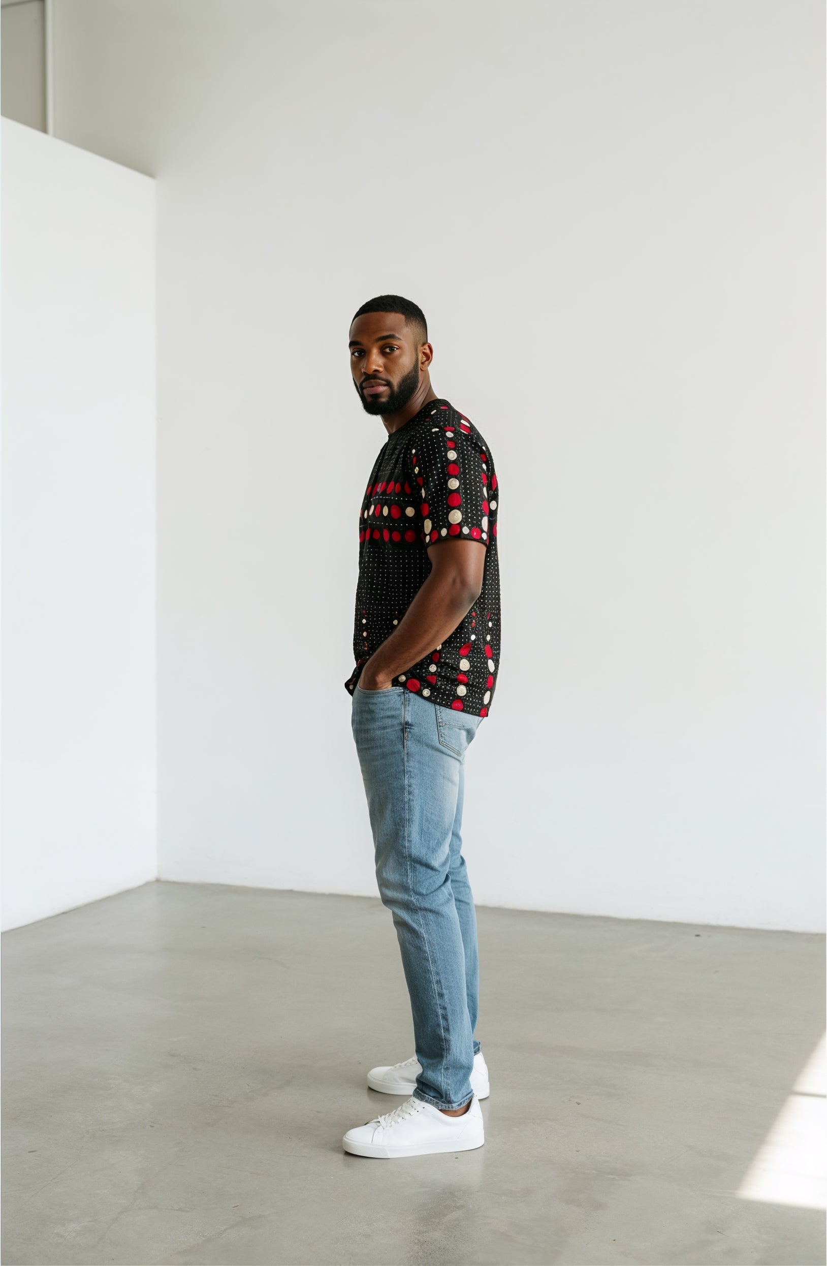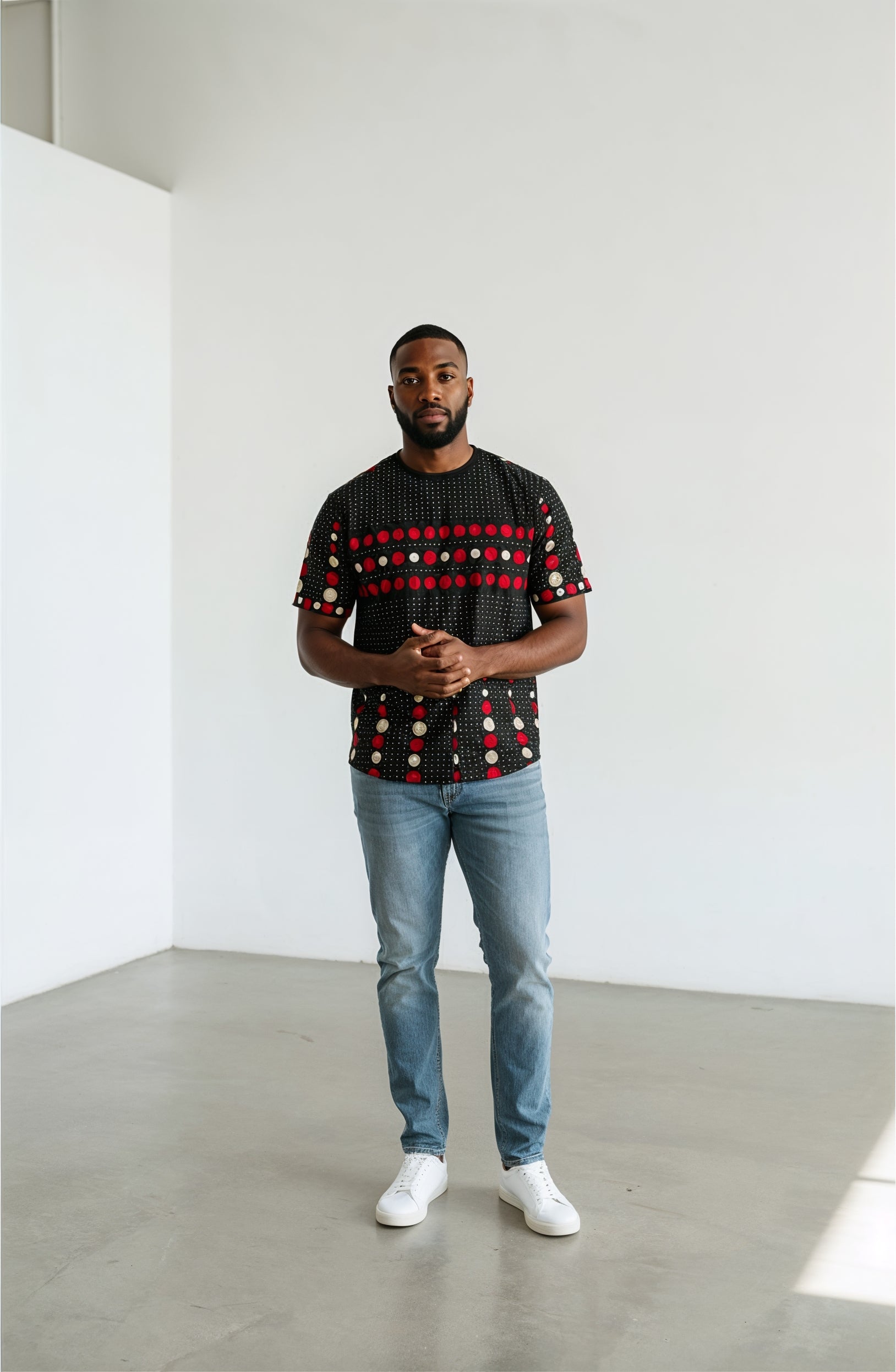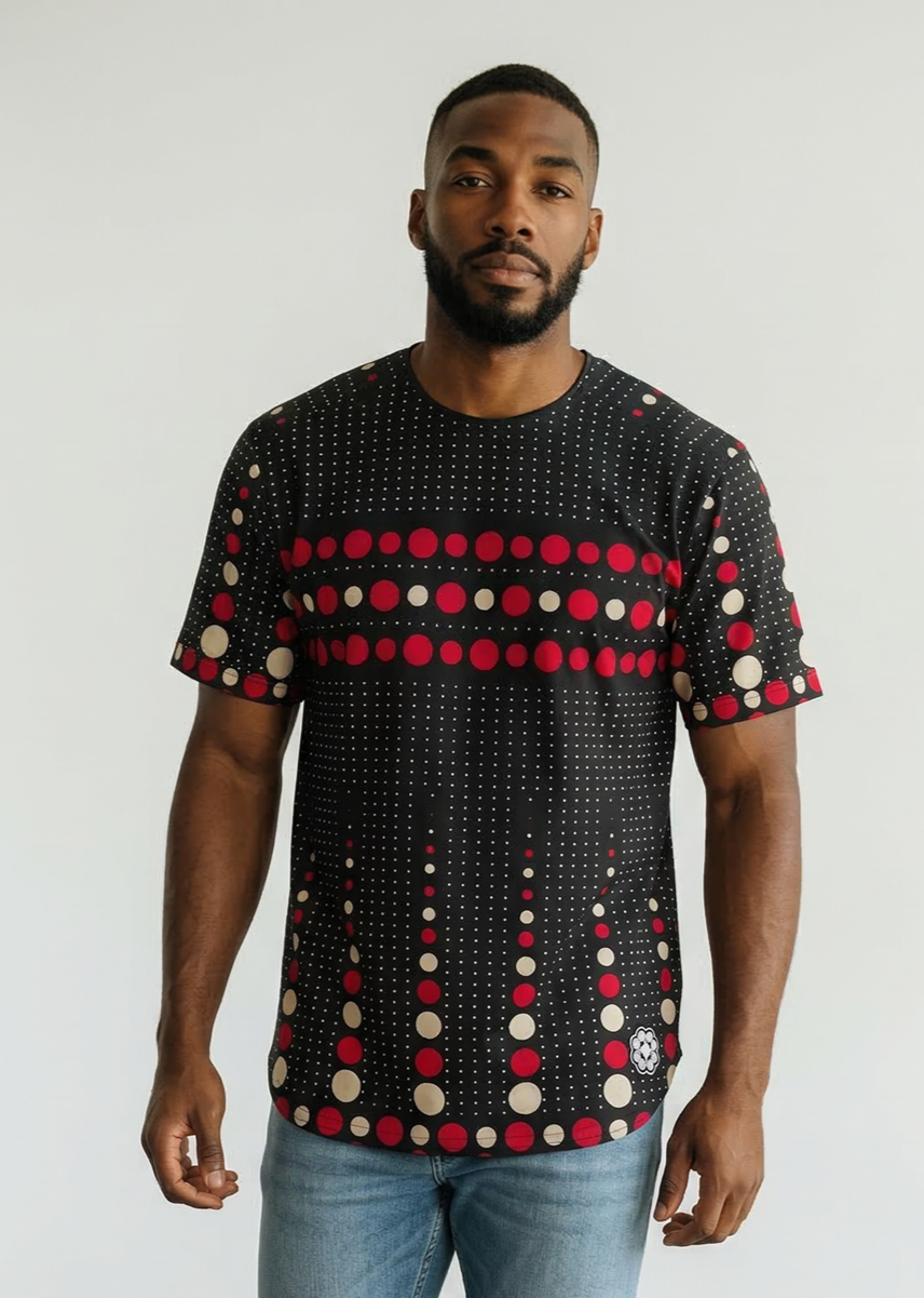 Crafted from 100% cotton, the Matla Shirt offers a soft, breathable feel that keeps you comfortable throughout the day. The striking black base with bold red and cream circular patterns creates a powerful visual rhythm, symbolizing unity, energy, and movement. The clean tailoring ensures a refined silhouette that works effortlessly whether worn casually with denim or styled for a more elevated look.