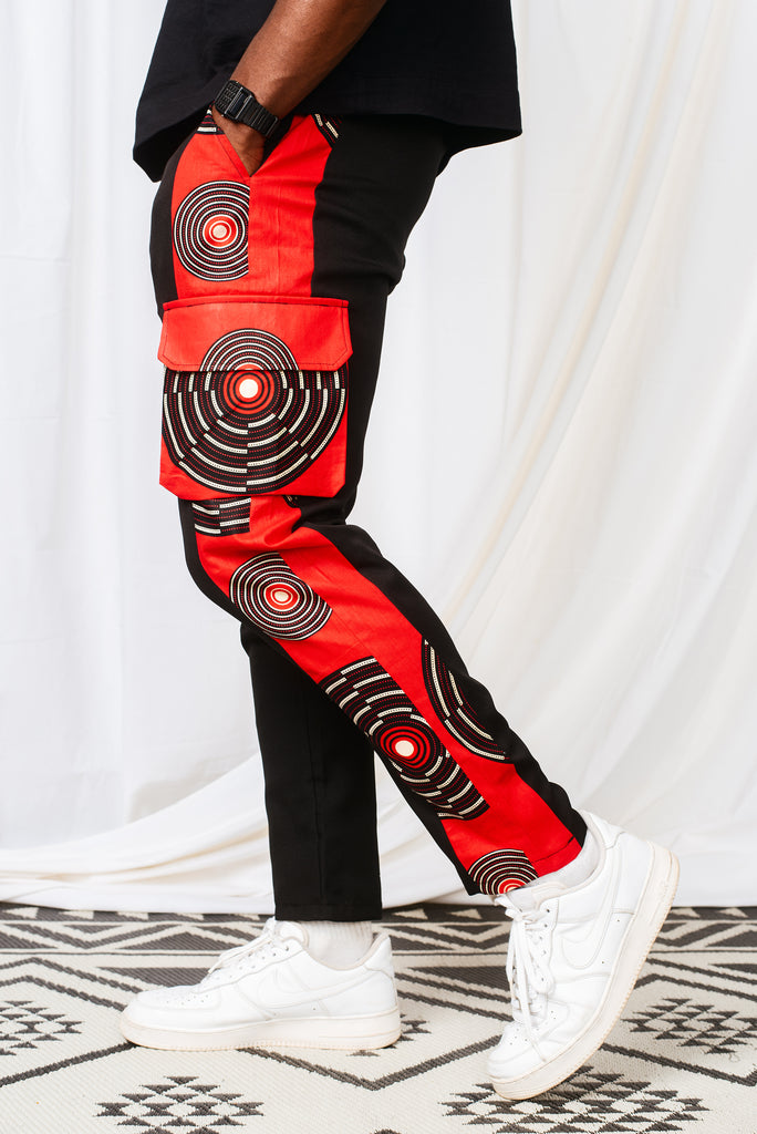 Clean, versatile, and culturally inspired, these cargo pants feature a classic fit with two functional cargo pockets, two side pockets, and a back pocket. Detailed with striking side Maasai Ankara panels and finished with black and white logo embroidery, they combine practicality with contemporary style.