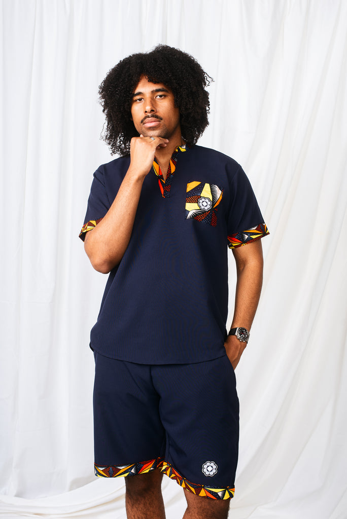 Knee-length and crafted for everyday comfort, these shorts feature side-entry pockets, a relaxed waistband with elastic detailing, and a clean, tailored fit. Made in navy with striking Ninzi Ankara print accents, they strike the perfect balance between culture and contemporary design.