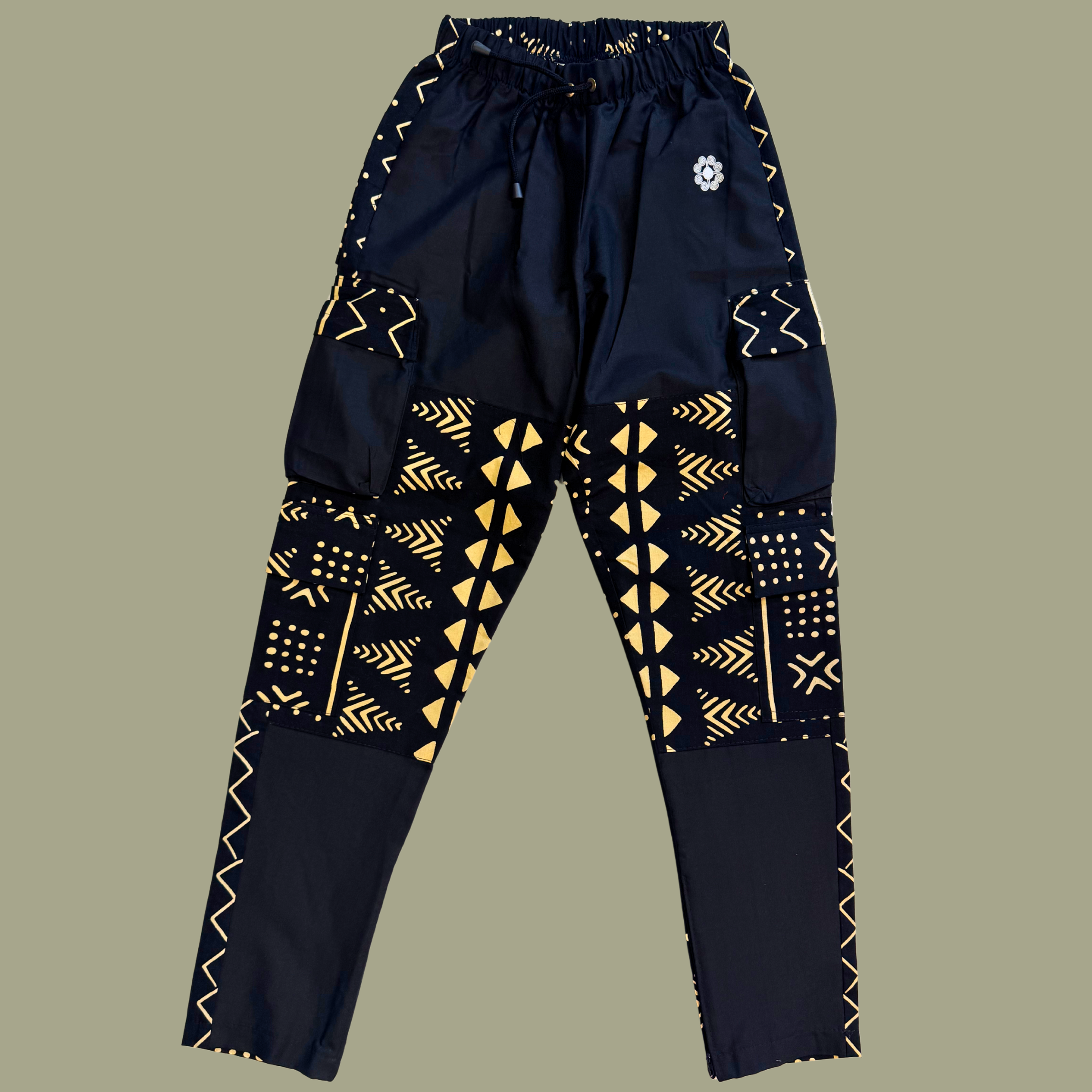 Our Bogolan-Inspired Pants are a perfect blend of comfort and craftsmanship. Featuring an elastic waist for an easy fit, cargo pockets for utility, and white embroidery and traditional Bogolan motifs. A versatile piece that celebrates African artistry through modern design.